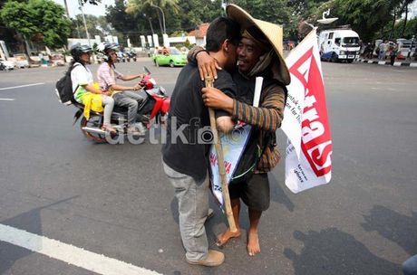 Pada Kamis 14 Juni, dia berangkat ke Jakarta dikawal Harsowiyono alias Kopral (42) dengan motor. Kedua orang ini berangkat dari titik depan pos pantau BPLS Desa Siring, Porong Sidoarjo. Hari berjalan kaki selama 25 hari dan tiba di Kantor Kontras di Jl Borobudur, Minggu 8 Juli 2012, setelah menghabiskan 8 sandal jepit.